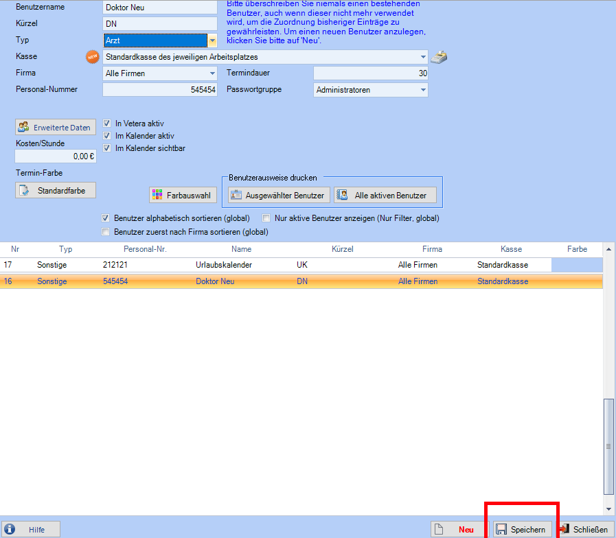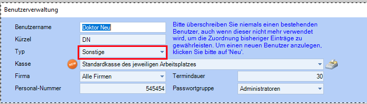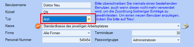 Stellen Sie sicher, dass der Typ „Arzt“ ausgewählt ist.