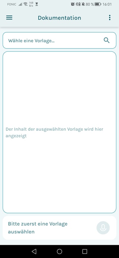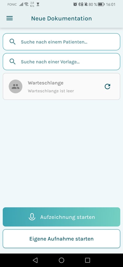 - Klicken Sie auf "Suche nach einem Patienten" oder "Eigene Aufnahme starten". Bei einer Aufnahme mit einem Patienten, wird die Genehmigung zur Audioaufnahme von diesem eingeholt. Bei einer eigenen Aufnahme, diktieren Sie alleine nach der Konsultation:
